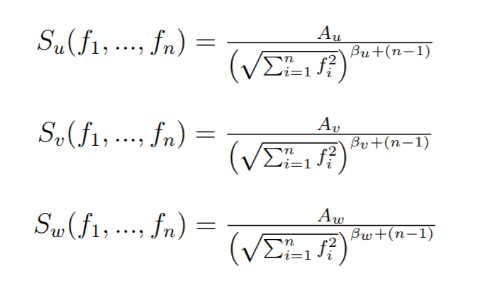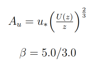 Su, Sv, Sw refer to power spectral values at each frequency for velocities in the x, y, and z directions respectively. These values are dervied from the 1/fβ noise formula above, where beta is chosen from analyzing spectra of real-world wind data. The A values are based off the real-world wind velocities and scale the spectrum values. We assume that turbulence in the secondary directions (v and w) are simply some smaller scalar multiple of the velocity in the main direction.