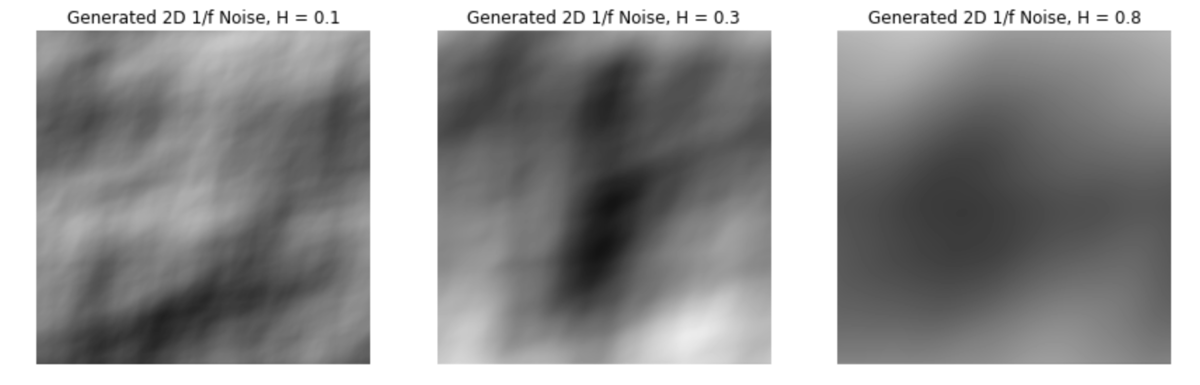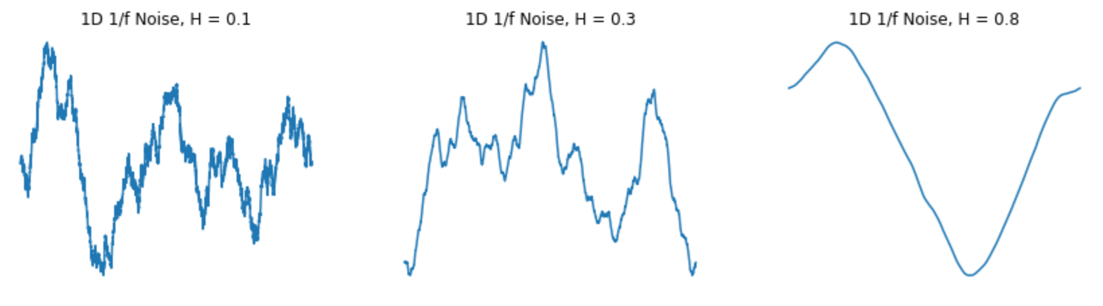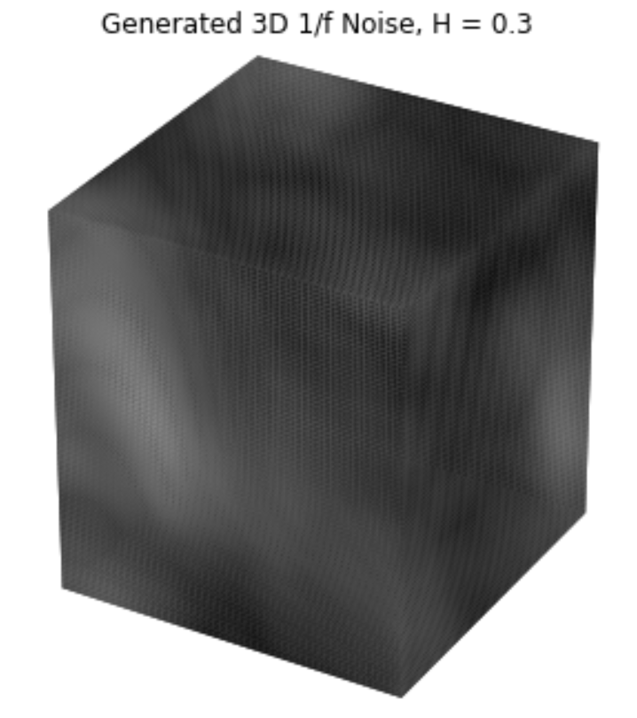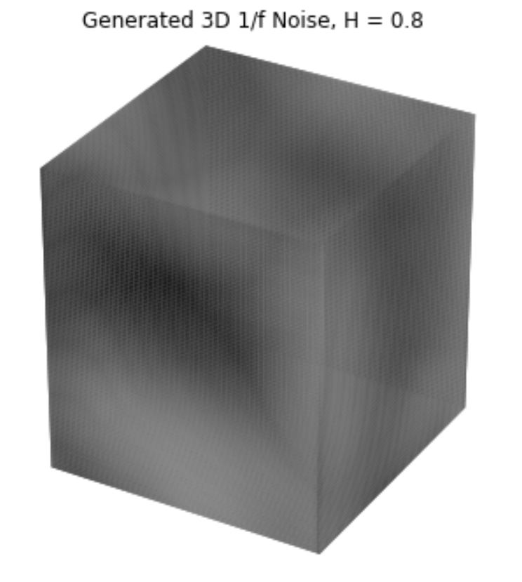 Noise, as defined by Oyundolgor, is "the random number generator of computer graphics" [1]. Noise is a simple and efficient to compute method of modelling the fluctuations and patterns of wind. In the paper, Oyundolgor describes of 1/fβ noise, where f f refers to frequency, and β refers to an exponent determining the fluctuation of the signal. This type of noise has a power spectral density (PSD) -- the power present at each frequency in a signal -- proportional to 1/f and is found in many natural phenomena, including wind velocities. In order to generate this noise, we begin by creating white noise from sampling from a standard normal distribution and then apply a fast Fourier transform to convert it into the frequency domain. We then multiply these values by a formula proprtional to 1 / frequency and apply an inverse fast Fourier transform to convert back into noise values in the time domain. This generates a simple form of 1/fβ noise. We assume that the data is sampled at 1Hz, and so the frequencies we need to calculate the spectrum values from range from 1/N hz to 1/2 Hz (Nyquist) with a step size of 1/N hz, where N is the number of samples taken in the time signal. This noise generation process can be generalized to higher dimensions by taking n frequency values for an n-dimensional signal at each timestep, using the same range and step size of frequencies for each dimension as in the 1-D case. Examples of 1-D, 2-D, and 3-D 1/fβ noise are included below.